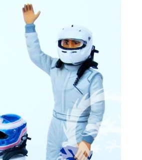 -jedną figurkę dziewczyny w roli kierowcy rajdowego lub wyścigowego stojącą z ręgą wyciągniętą w górę
